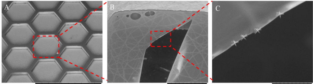 Scanning electronic microscopy of A) arrays in culture patch B) and (C) self assembled collagen IV membrane with gelatin nanofibers backbones.