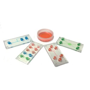 Integrated chips were manufactured by mass production. The upper part is a plastic plate with standard Luer connectors and an elastomeric thin film for conformal contact with the lower part in which microfluidic circuits can be patterned. The lower part can be a sheet in plastic, elastomeric, glass, silicon or other materials.
